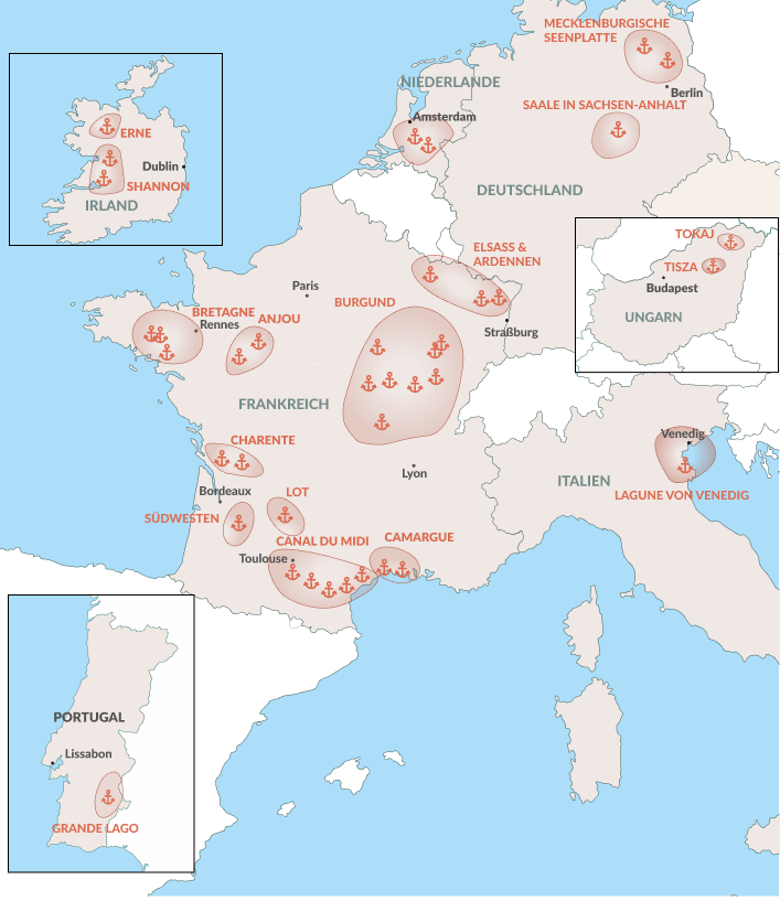 Auswahl des Reiseziels: Wählen Sie aus einer Vielzahl von Angeboten wie dem Canal du Midi, der Bretagne oder der Lagune von Venedig das Gebiet aus, in dem Sie segeln möchten.