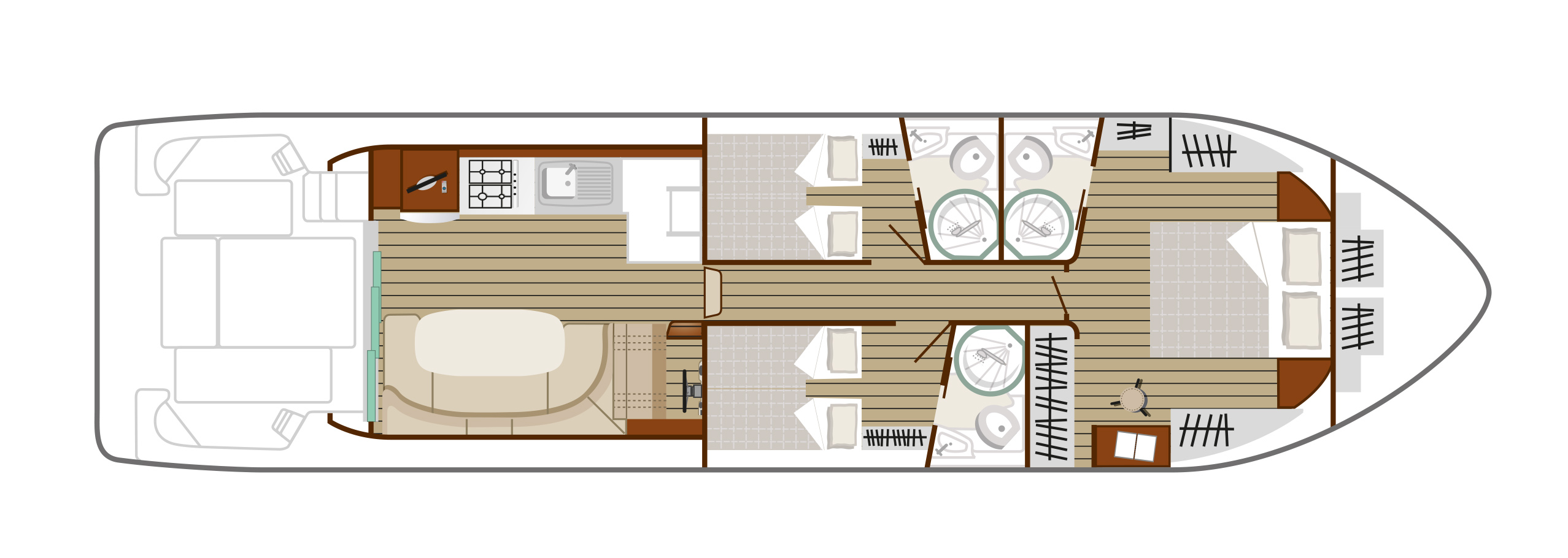 Der Cruiser Premium+ XL für 6/8 Personen ist ein ideales Hausboot für drei Paare oder zwei Paare mit zwei Kindern. Er verfügt über drei Kabinen mit eigenem Bad sowie einen großzügigen Wohnbereich. Dank Bug- und Heckstrahlruder lässt sich das Boot besonders leicht manövrieren.